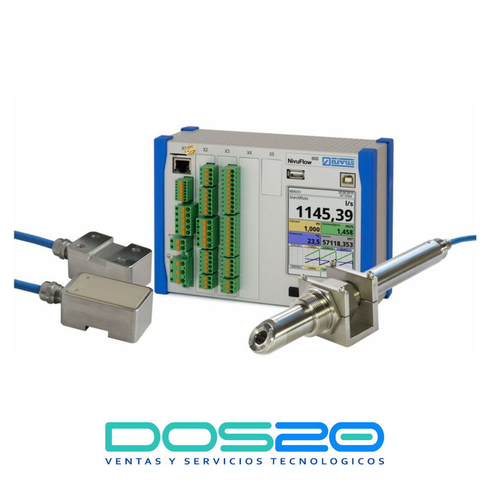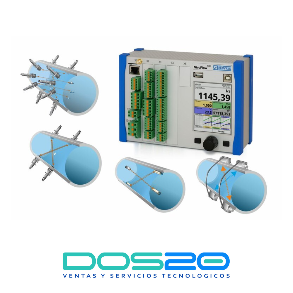 El NivuFlow 600 (NF600) es el caudalímetro preciso por medio de la tecnología Tiempo de Tránsito con sensores de inserción o sin contacto con el medio tipo Clamp-On.